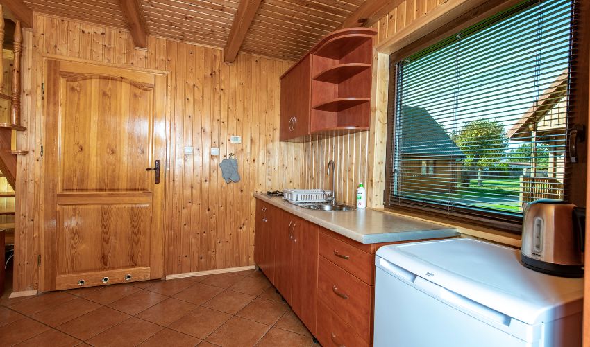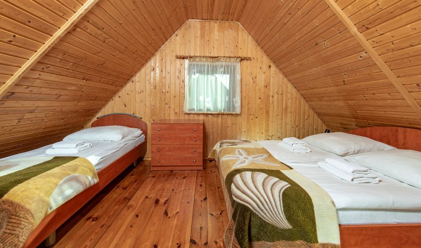 Nasze wygodne, jednopiętrowe domki to idealne miejsce na rodzinny wypoczynek lub pobyt z przyjaciółmi. W domku znajdują się dwie sypialnie – w każdej z nich przygotowano łóżko małżeńskie oraz jednoosobowe łóżko, co zapewnia komfortowe miejsce do spania dla kilku osób. W salonie znajduje się dodatkowo rozkładany narożnik, który może posłużyć jako kolejne miejsce do spania. Domki są w pełni wyposażone, z lodówką, telewizorem, internetem, suszarką do włosów, zestawem plażowym oraz niezbędnymi udogodnieniami, aby zapewnić wygodę i przyjemność podczas całego pobytu.